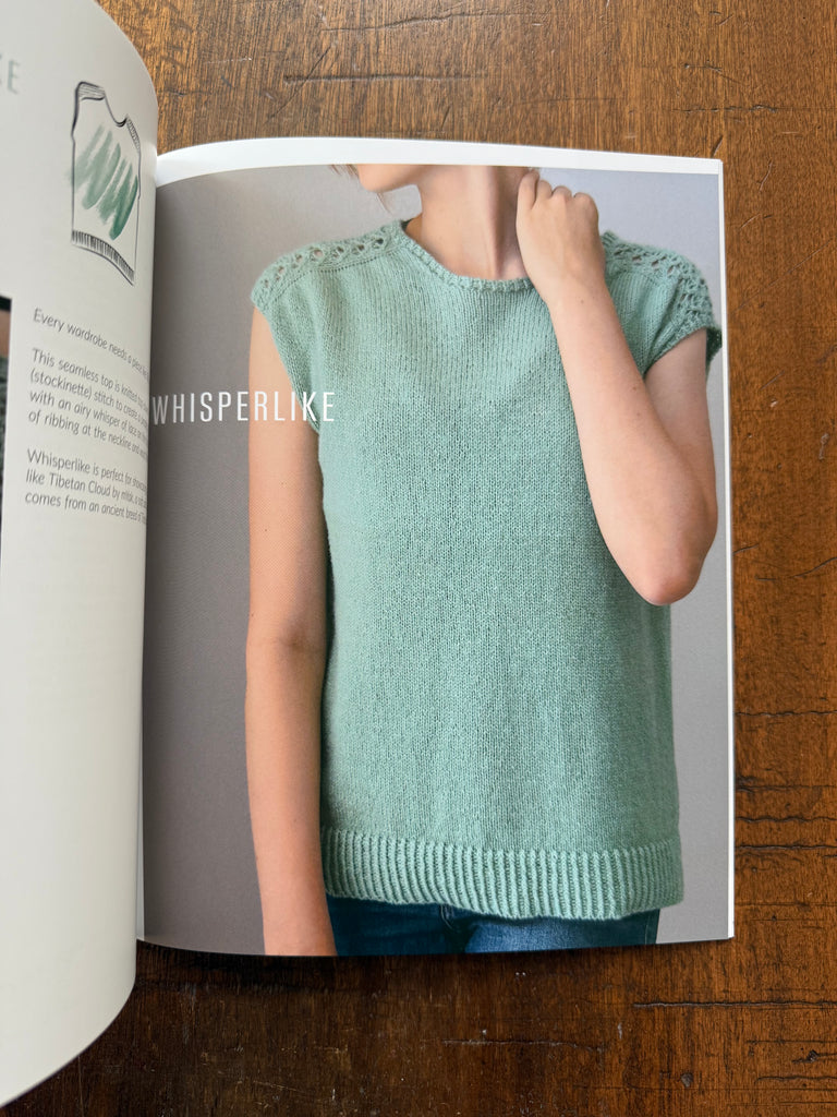 - Whisperlike: a seamless top-down knit with ribbing at the waist and neckline, and delicate lacework on the shoulders.