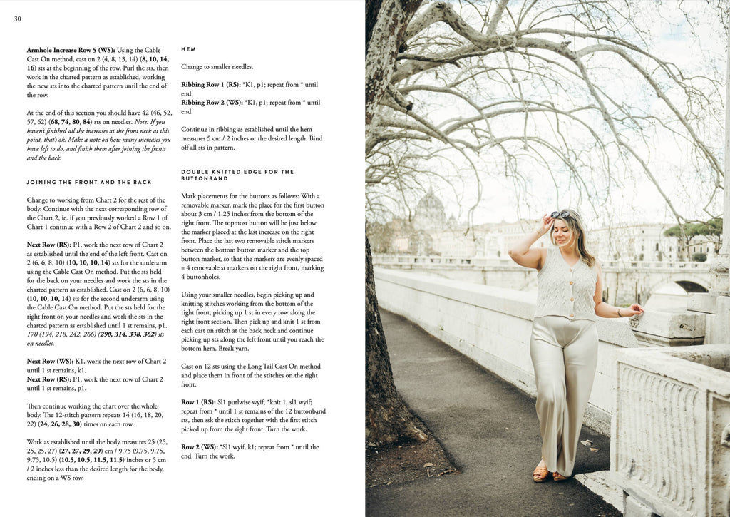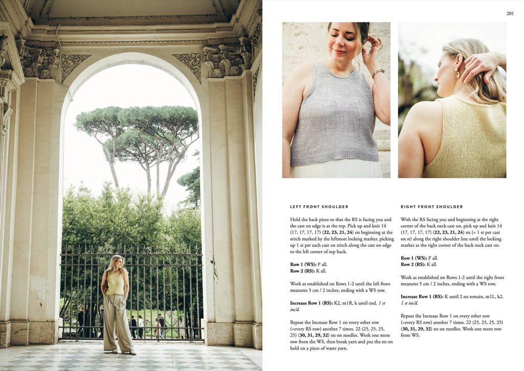 The designs, photographed in the stunning light of Rome, capture the essence of warm, sunlit days and balmy evenings. Each design is inspired by an ancient Roman goddess, capturing the timeless beauty of its namesake. Sari’s clear instructions and attention to detail make these patterns accessible to knitters of all levels.